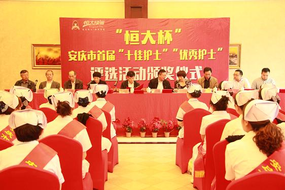 由安庆市委宣传部、安庆市文明办、安庆市卫计委和安庆日报社共同主办的“恒大杯安庆市首届“十佳护士”“优秀护士”表彰大会,5月11日在恒大绿洲隆重举行,副市长黄杰出席表彰会并讲话,市委宣传部、市文明办、市卫计委和安庆日报社领导向获奖护士颁发荣誉证书和奖品。