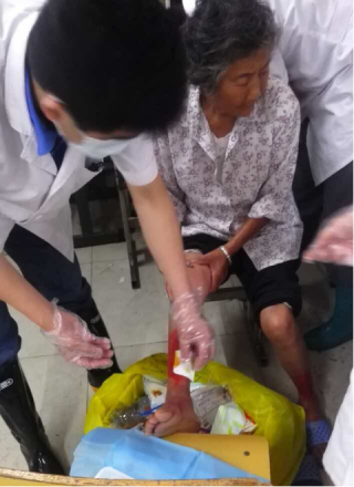 7月5日,持续奋战十几个小时的安庆市红十字博爱医院医疗小分队,依然坚持早起,来到医疗救助点,为受灾群众继续医疗救助。风雨中,一位满头银发、步履阑珊的老婆婆一瘸一拐的迎面走来,脸上的表情十分痛苦。忙碌中,安庆市红十字博爱医院的骨科方海斌医生注意到这位老婆婆,连忙上前搀扶,边走边说:“婆婆,您这脚溃烂的面积比较大,伤情比较严重,家里人怎么没陪您一起来呢?”婆婆回答说:“我让他们都去一线啦!”方医生愣了会,随即明白了什么,便蹲下,叫来护士协助,仔细地为老人消毒清洗伤口,娴熟的手法在包扎的过程中,老人始终面带微笑,频频称赞。安庆市红十字博爱医院医疗小分队细心的救助和护理,犹如洪水中的暖流”,温暖而倍感亲切。