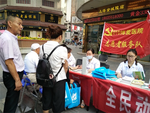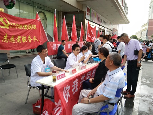 志愿者们态度和蔼的为每位市民量血压,教授他们慢性病的保健办法。还不厌其烦地为众多市民朋友们诊断病情、排忧解难,使每个人进一步了解了常见病的发病症状、影响因素及注意事项,并叮嘱老年群众每天坚持适当锻炼,注意饮食清淡,一定要科学饮食,每年都要定期进行健康体检。志愿者服务队还向现场群众发放医疗健康知识手册、科普小知识,向群众普及医疗常识。安庆博爱医院通过这次义诊活动,让市民朋友们提高了健康意识、防病意识、保健意识,为宜城百姓献上了一场健康盛宴,展现了医护人员崇高的奉献精神。