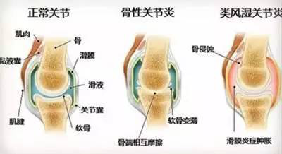 类风湿性关节炎多见于青壮年,常发生于手足小关节及骶髂部,并逐渐累及全身关节。初始患病关节亦表现出红、肿、痛及活动不便等,久则关节畸形或强直。外伤性关节炎多因外伤或持续慢性劳损引起关节软骨发生退行性变或形成骨刺,表现为患病关节肿、痛及运动障碍,易发生在持重关节、如肩、膝、踝等关节,运动员及青壮年中多见。骨性关节炎是一种最常见的关节病变,多见于肥胖超重的中老年人,最常发病的部位是膝、手指、颈、腰椎等处,症状主要为关节疼痛、僵硬(经轻微活动后会觉疼痛减轻),重者可出现关节肿胀、肌肉萎缩等。
