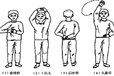 3、重视积极的不超量的患肩运动,合理的医疗运动疗法,对早中期本病患者起着预防粘连和控制粘连加重与肌肉萎缩的作用,目前此类的运动很多,我们主张简而精体疗,如: