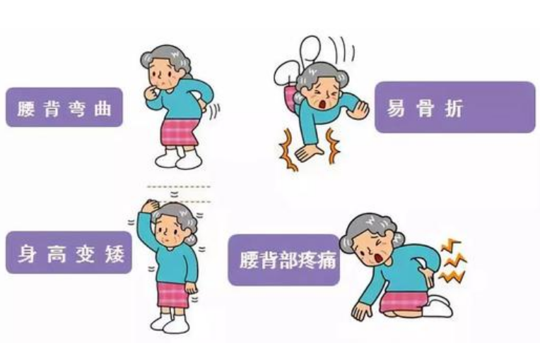 骨折:骨质疏松后由于骨质变脆,轻微的碰撞都可导致骨折,且骨折难以恢复,常以腰椎和股骨骨折多见。一般认为是摔伤造成的,但事实上跌倒仅是诱因,而骨质疏松才是真正的原因。