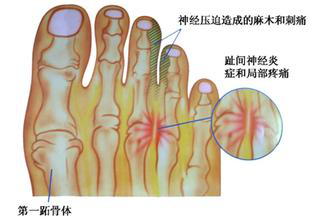 趾间神经痛的特征是沿着一支或多支足部神经向趾球或足趾放射的突发性疼痛,这可能系保护足部趾间神经的脂肪垫的消失。反复的轻度外伤或不适当的穿鞋所致,趾间神经瘤表现为一支或多支趾间神经周围的渐进性的良性增厚和增大,在早期患有这种神经瘤的病人仅主诉跖球部轻度疼痛或不适。最常见的部位为第4跖骨头区,有时有烧灼感或针刺感,病人可感觉宛如在跖球内有一石块,通常在穿某一款式的鞋时。其症状比穿另一式样的鞋时更为明显。